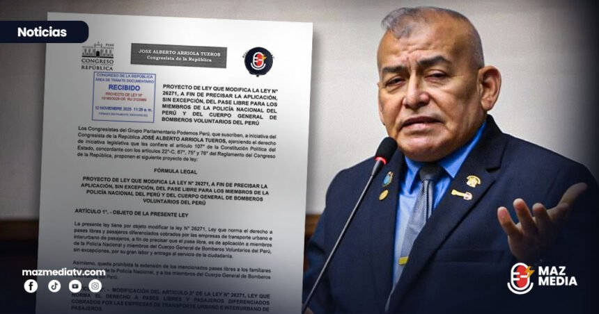El congresista José Arriola, de Podemos Perú, presentó el proyecto de Ley N°13180/2025-CR  que propone modificar la Ley N° 26271 con la finalidad de aplicar, sin excepción, el pase libre para los miembros de la Policía Nacional del Perú (PNP) y del Cuerpo General de Bomberos Voluntarios del Perú (CGBVP).