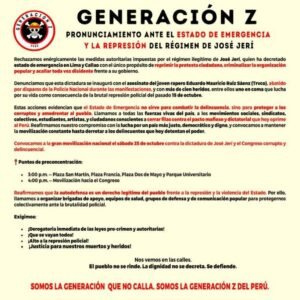 La convocatoria se da en medio del Estado de emergencia decretado por el presidente José Jerí, medida que restringe derechos como la libertad de reunión y el libre tránsito. De acuerdo con el decreto, toda concentración pública debe contar con autorización oficial, disposición impuesta para frenar la violencia urbana que atraviesa el país.