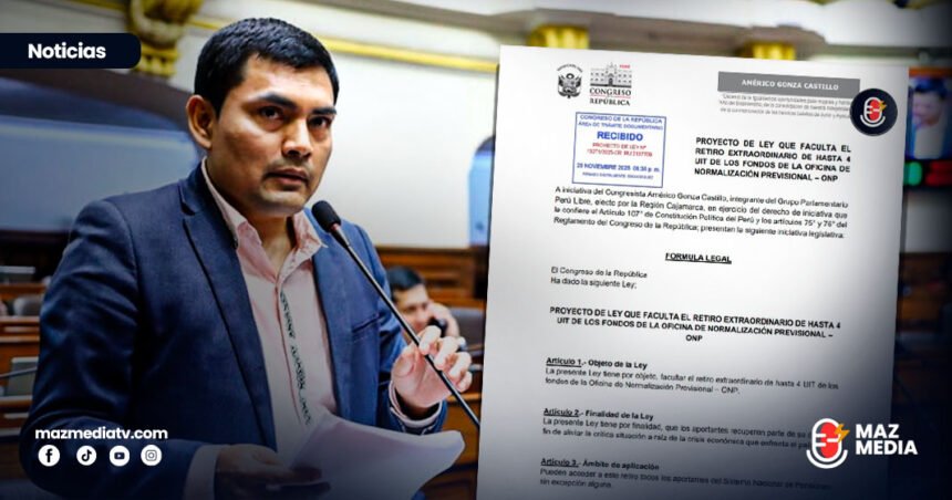 El congresista Américo Gonza, del grupo parlamentario Perú Libre, presentó el proyecto de Ley N° 13271/2025-CR que propone facultar el retiro extraordinario de hasta 4 UIT de los fondos de la Oficina de Normalización Previsional – OPN. Asimismo, la propuesta permitiría que los afiliados puedan disponer de una parte de sus aportes obligatorios, en atención a la difícil situación económica que atraviesa un amplio sector de ciudadanos que, luego de haber aportado durante años, no cuentan con recursos suficientes para atender sus necesidades básicas.